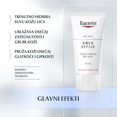 Eucerin Dnevna krema za lice sa 5% uree je lagana i nežna hidratantna krema za suvu i veoma suvu zategnutu kožu za svakodnevnu upotrebu. Obogaćena ureom i mlečnim kiselinama, dva prirodno prisutna jedinjenja koja vezuju vodu, trenutno hidrira suvu kožu lica, ublažavajući osećaj zategnutosti, pružajući koži osećaj glatkoće i gipkosti. Gruba koža je često posledica nedostatka vode, a Eucerin Dnevna krema za lice sa 5% uree ublažava simptome grube kože, tako što je čini hidriranom. Idealna je kao podloga za šminku ili nakon brijanja.
