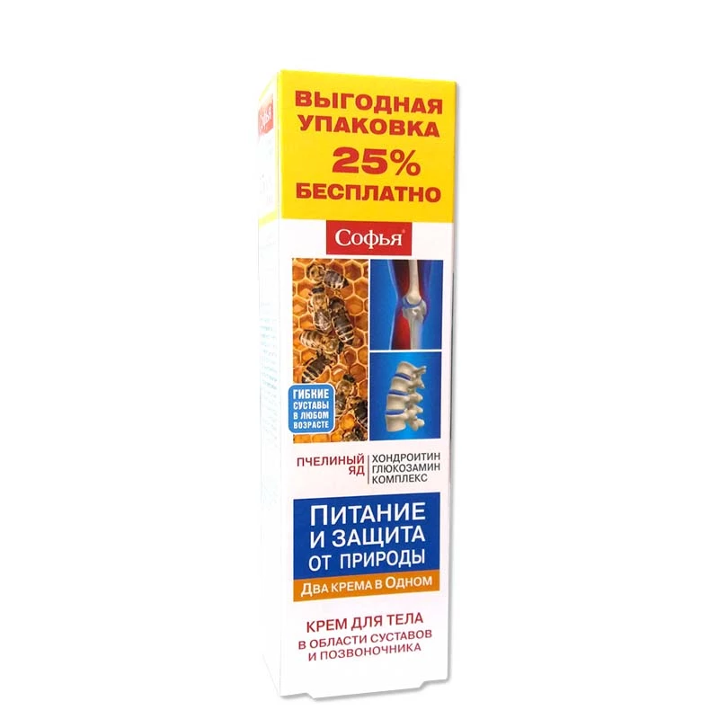 Sofija krem sa pčelinjim otrovom i kompleksom hondroitin-glukozamin je efikasan hondroprotektor, prirodno sredstvo za profilaksu oboljenja zglobova i kičme. Delovanje: Potpomaže prirodnu regenraciju hrskavičavog tkiva, snabdeva zglobove elementima za aktivno obnavljanje. Sprečava razvoj destruktivnih procesa i starenje zglobova. Održava u funkcionalnom stanju koštano-mišićni aparat, smanjuje rizik od razvoja osteartroze i osteohondroze, deluje protivupalno, ublažava bolne simptome. Namena: